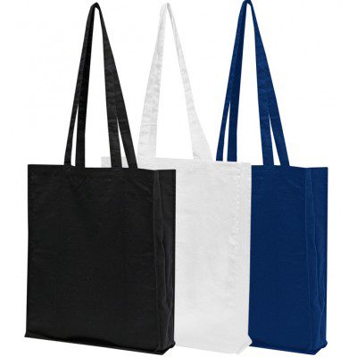 Coloured Calico Bag with long handles and a 100mm gusset. 140gsm coloured cotton bag. Size: 370 x 440mm. Bag Colours: Black, White, Navy Blue. Large print area. Made from dyed cotton, so colour is not always uniform - slight variations are to be expected. Calico is a traditional plain woven unbleached fabric made from semi-processed cotton. For conferences, fairs, conventions, markets, sample bags, shopping bags.